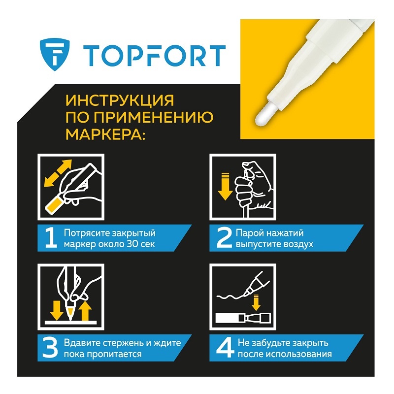 Предостережения: плотно закрывайте колпачок после применения, держать маркер вдали от источников тепла и воспламенения.