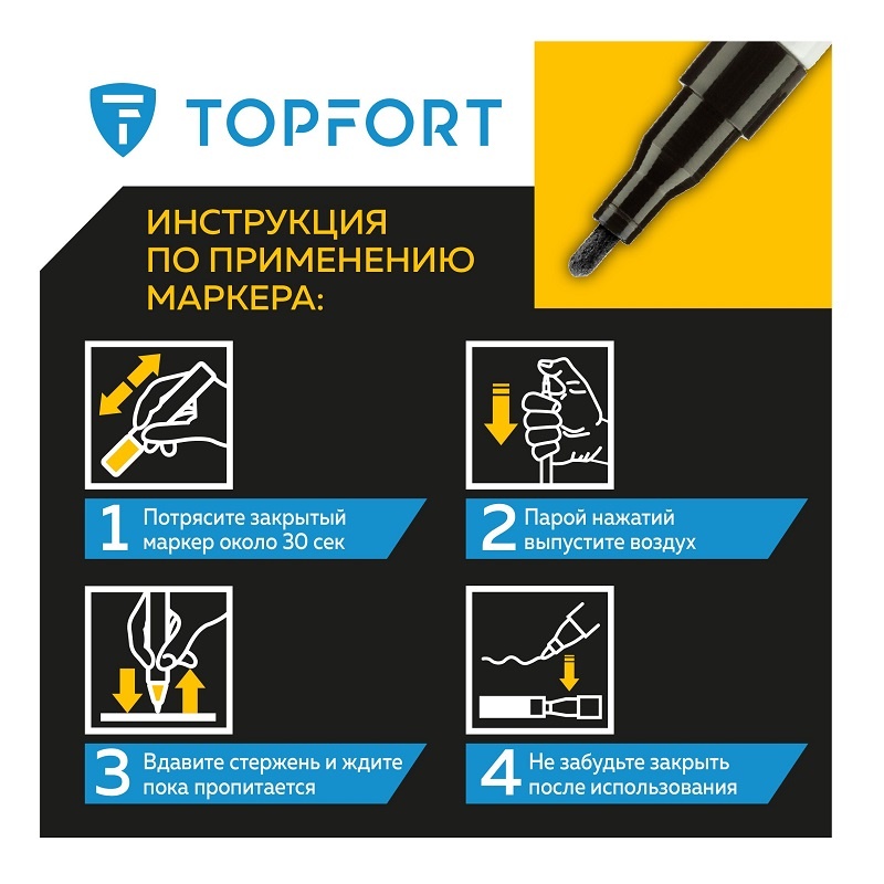 Предостережения: плотно закрывайте колпачок после применения, держать маркер вдали от источников тепла и воспламенения.